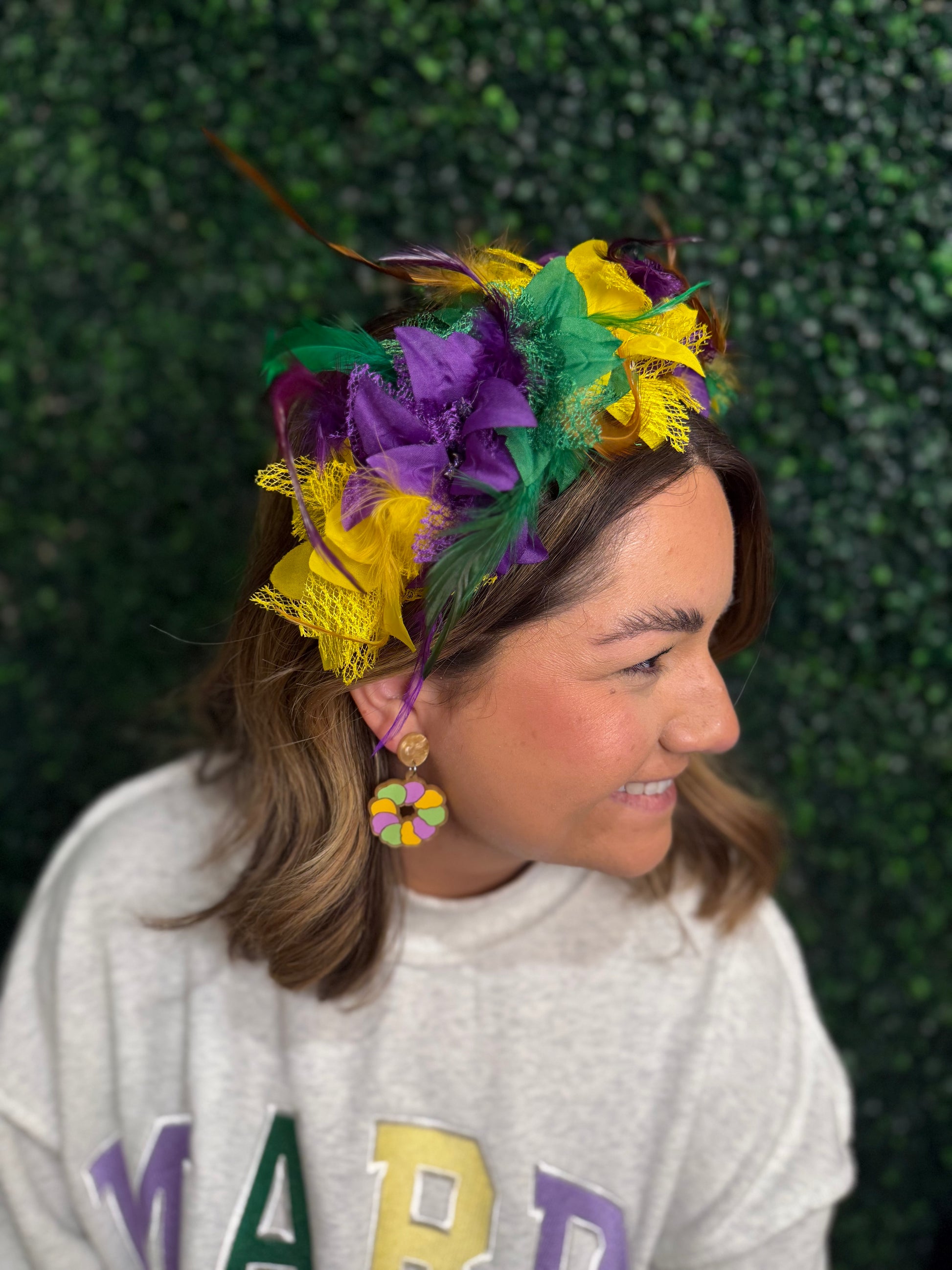 Get ready to party in style with our Mardi Gras flower headband! Perfect for adding a touch of festive flair to any outfit. Let the good times roll with this quirky and fun accessory! (Don't leave home without it!)